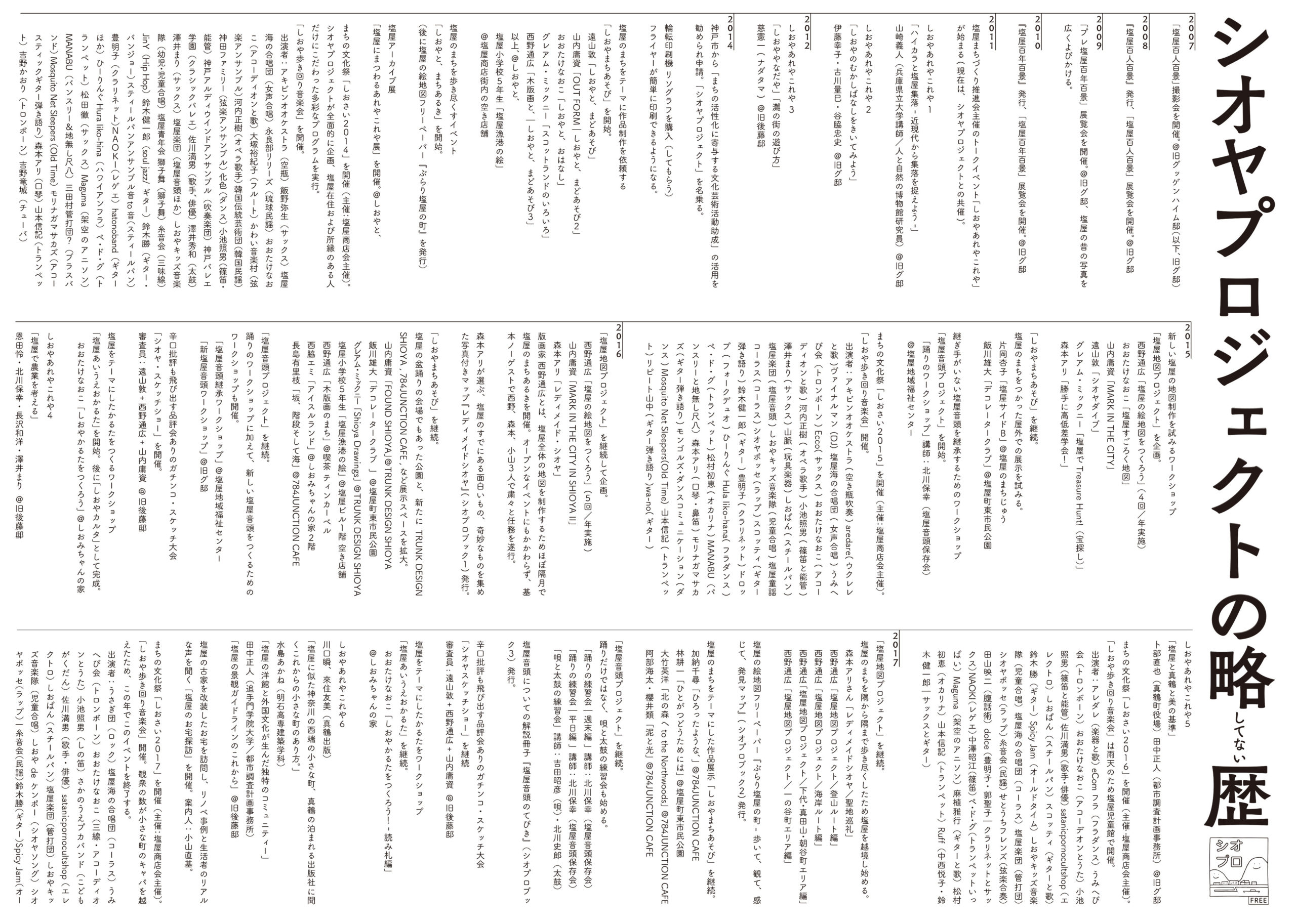 シオヤプロジェクトは、町をいじって遊ぶプロジェクト。海と山はあるが、特にこれといった観光名所のない塩屋。そんな、「なにもない」と言われがちな小さな町の、特徴や習慣、変なモノ・コトを面白がり、視覚化、文章化、イベント化して面白さを共有するのが「シオヤプロジェクト」です。