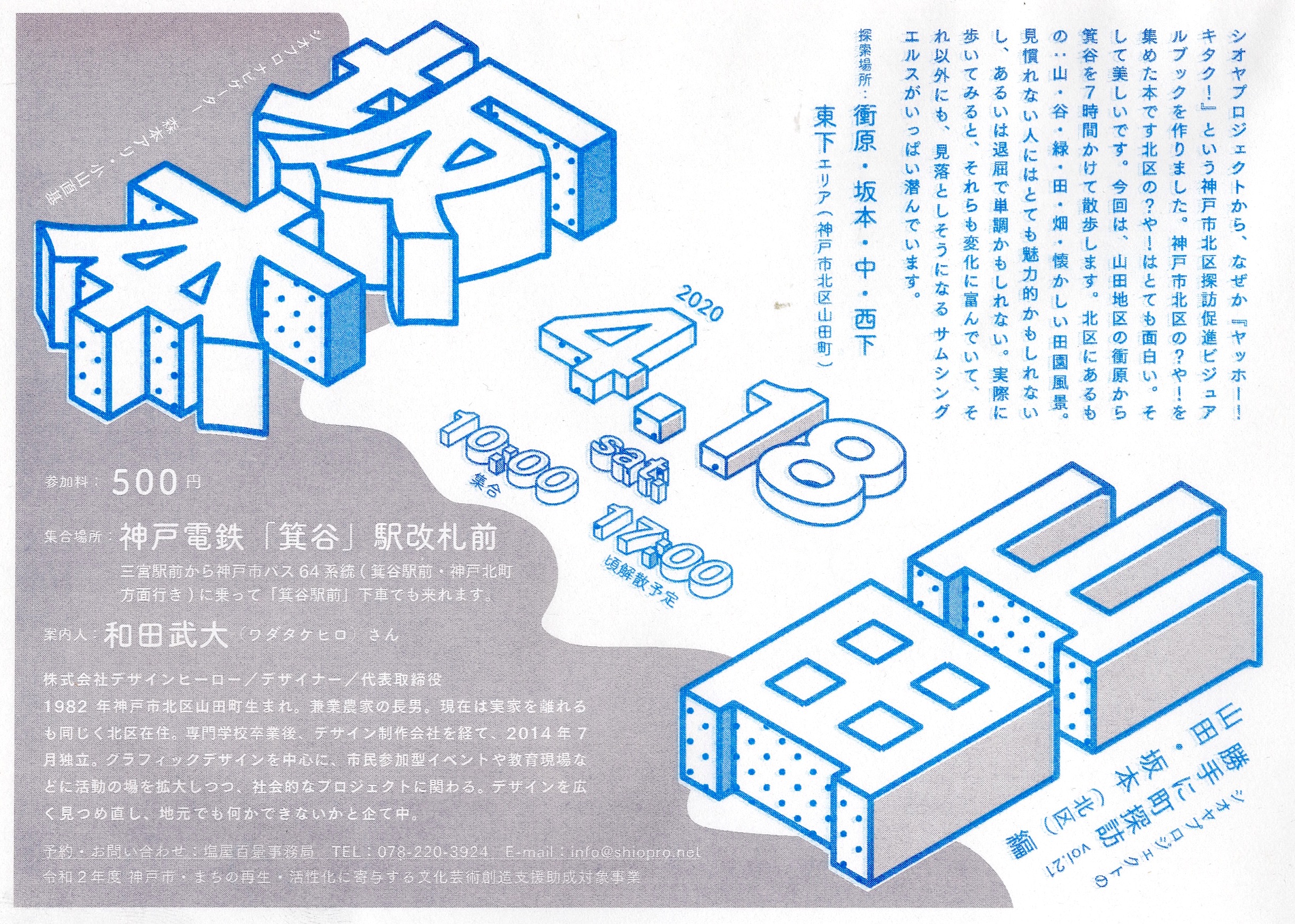 シオヤプロジェクトから、なぜか『ヤッホー!キタク!』という神戸市北区探訪促進ビジュアルブックを作りました。神戸市北区の?や!を集めた本です北区の?や!はとても面白い。そして美しいです。今回は、山田地区の衝原から箕谷を7時間かけて散歩します。北区にあるもの:山・谷・緑・田・畑・懐かしい田園風景。 見慣れない人にはとても魅力的かもしれないし、あるいは退屈で単調かもしれない。 実際に歩いてみると、それらも変化に富んでいて、それ以外にも、見落としそうになる サムシングエルスがいっぱい潜んでいます。