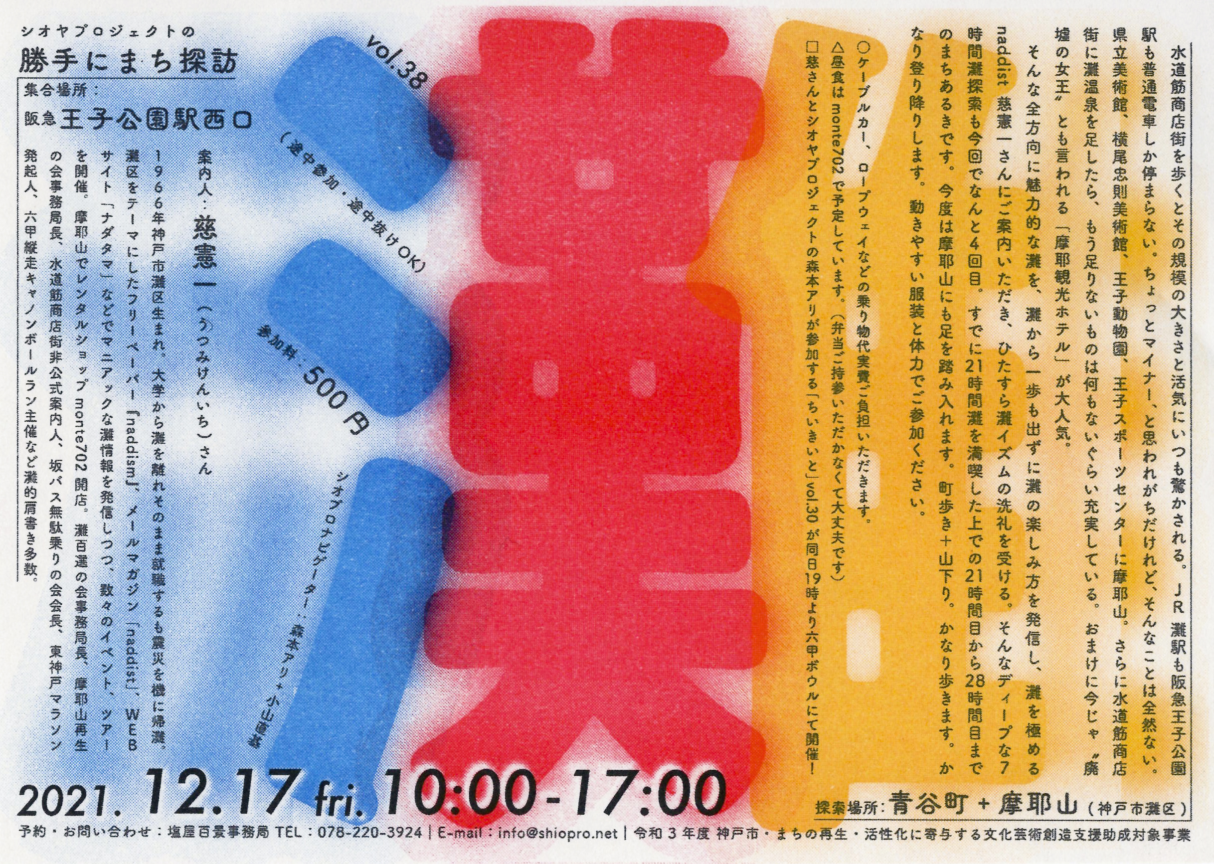 そんな全方向に魅力的な灘を、灘から一歩も出ずに灘の楽しみ方を発信し、灘を極めるnaddist慈憲一さんにご案内いただき、ひたすら灘イズムの洗礼を受ける。そんなディープな7時間灘探索も今回でなんと4回目。すでに21時間灘を満喫した上での21時間目から28時間目までのまちあるきです。今度は摩耶山にも足を踏み入れます。町歩き+山下り。かなり歩きます。かなり登り降りします。動きやすい服装と体力でご参加ください。