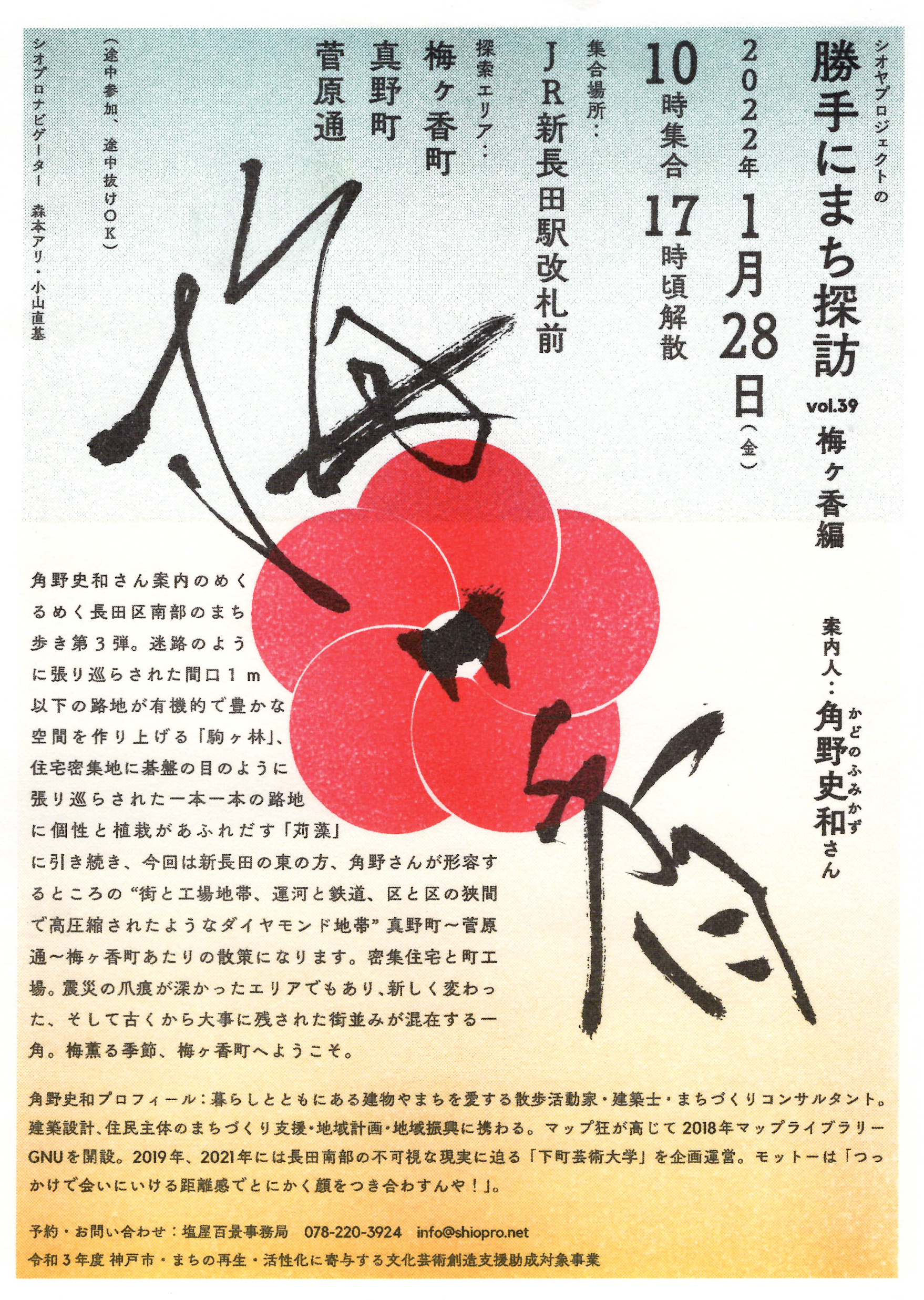 角野史和さん案内のめくるめく長田区南部のまち歩き第3弾。迷路のように張り巡らされた間口1m以下の路地が有機的で豊かな空間を作り上げる「駒ヶ林」、住宅密集地に碁盤の目のように張り巡らされた一本一本の路地に個性と植栽があふれだす「苅藻」に引き続き、今回は新長田の東の方、角野さんが形容するところの“街と工場地帯、運河と鉄道、区と区の狭間で高圧縮されたようなダイヤモンド地帯”真野町〜菅原通〜梅ヶ香町あたりの散策になります。密集住宅と町工場。震災の爪痕が深かったエリアでもあり、新しく変わった、そして古くから大事に残された街並みが混在する一角。梅薫る季節、梅ヶ香町へようこそ。