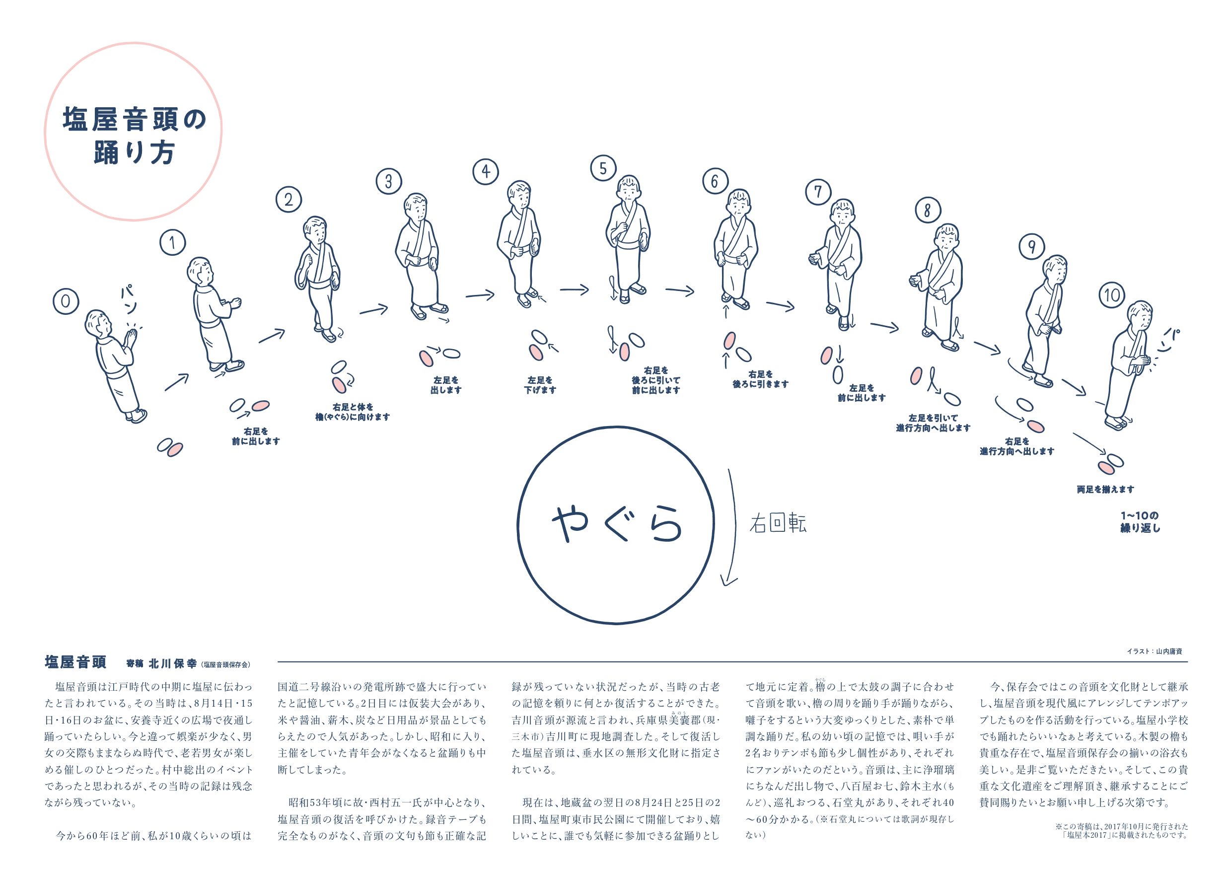 塩屋音頭は江戸時代から残る垂水の無形文化材であり、毎年8/24日,25日に行われる塩屋の盆踊りのハイライト。また30分延々と続く緩いビートとふにゃふにゃと揺れる唄いが極一部では話題。そんな塩屋音頭についてのてびきをつくりました。