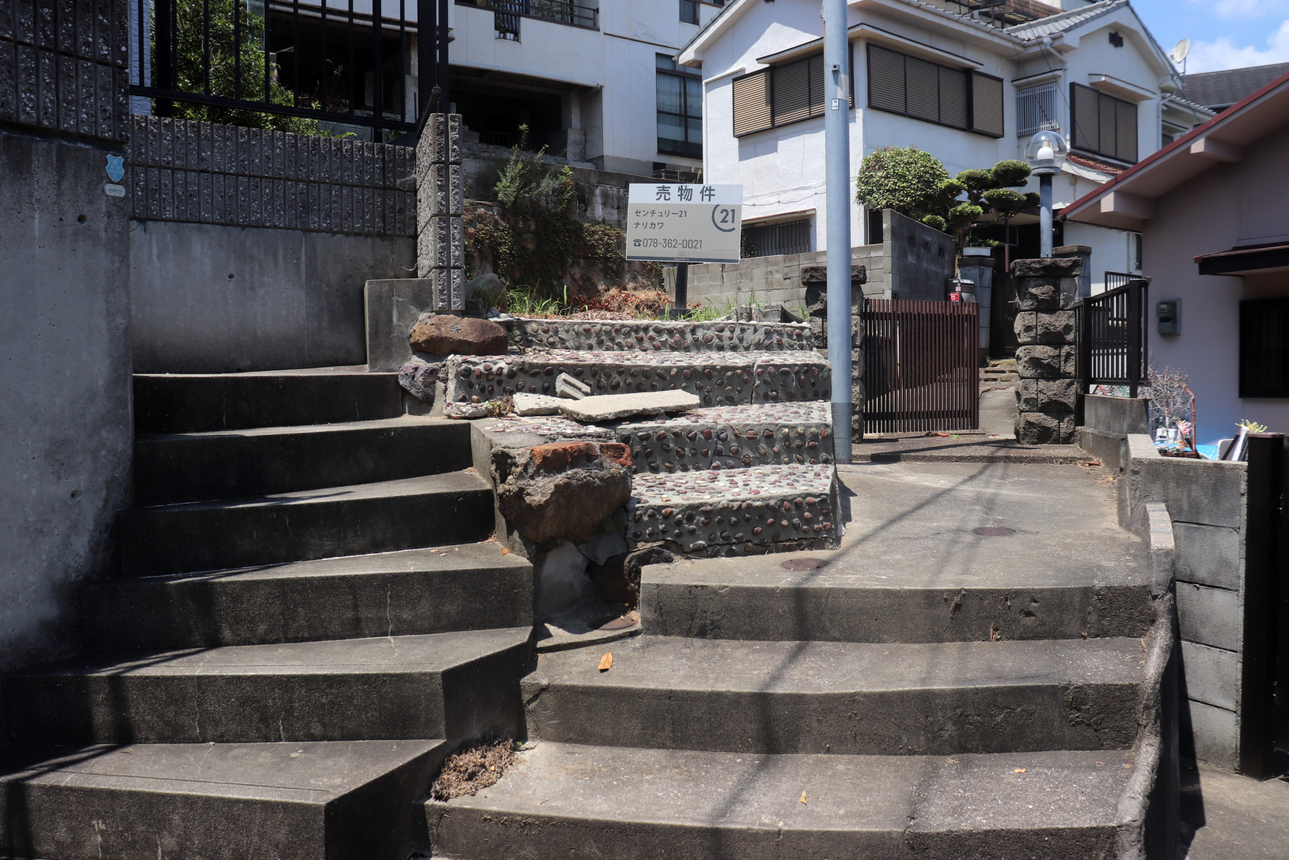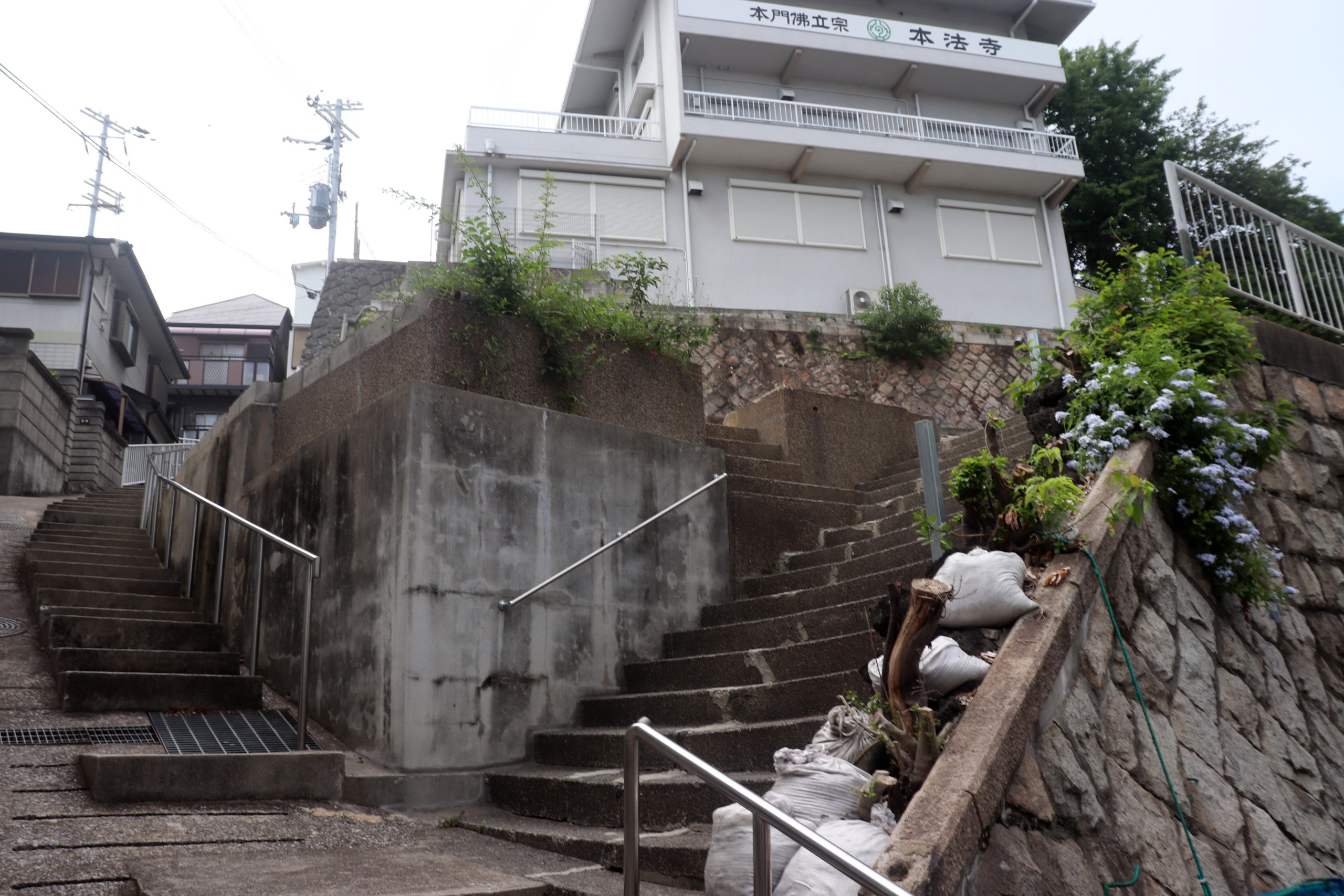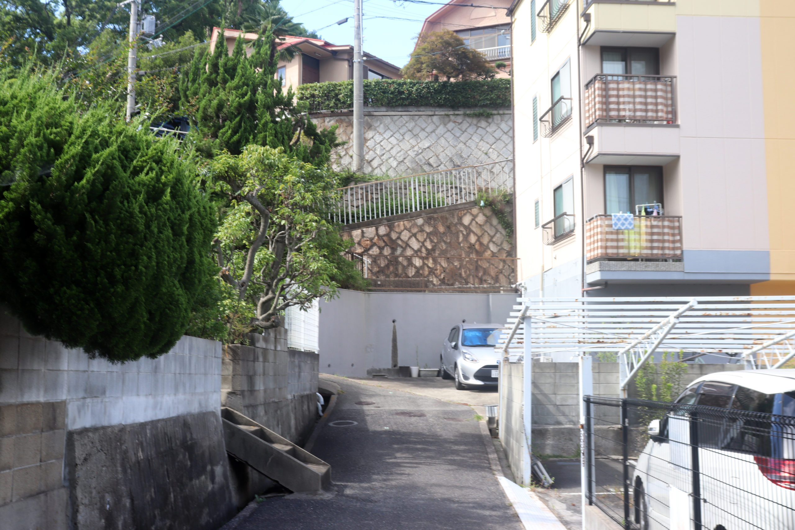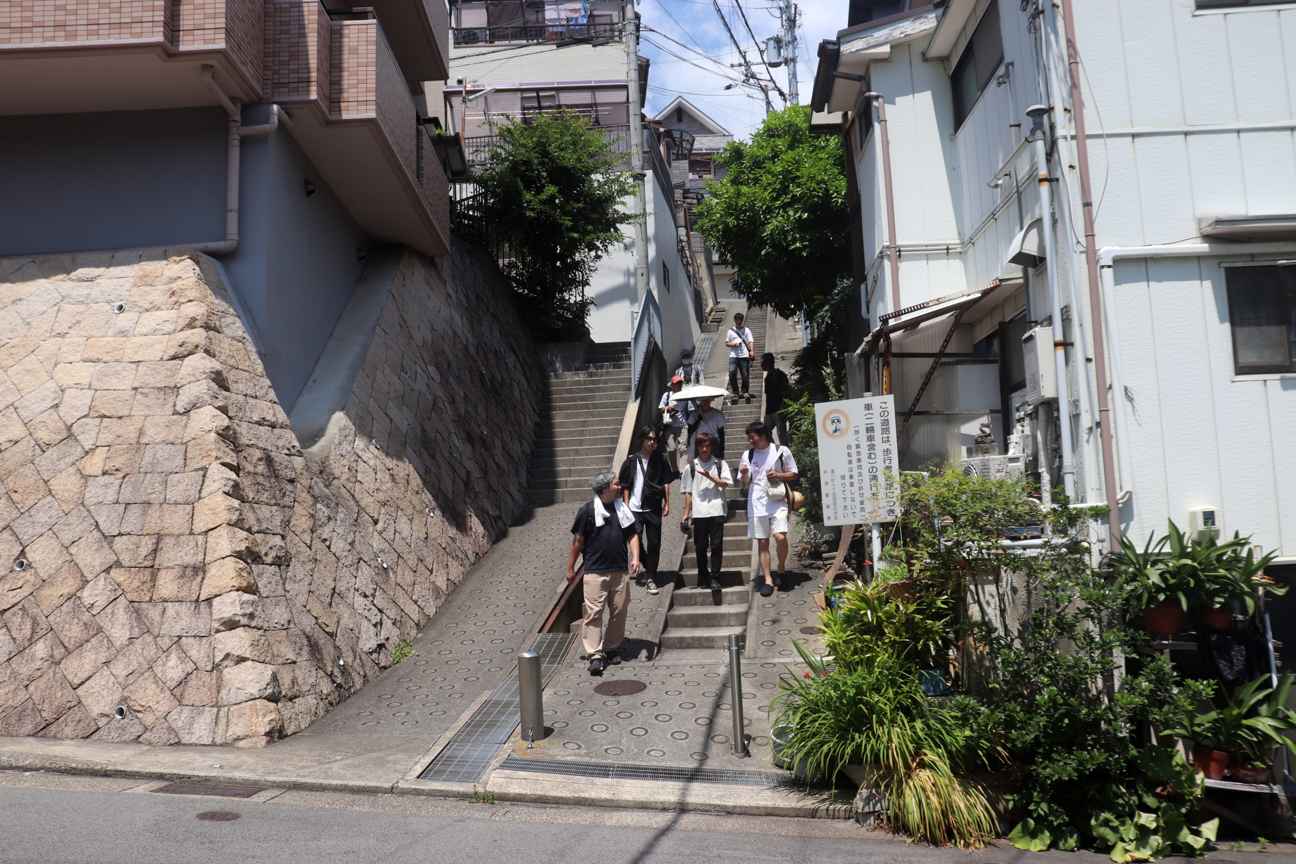 最初は上沢駅を起点に、校舎がグランドの土留めを果たしている市立神港橘高校付近から、新湊川のトンネルを眺め、房王寺線沿いの建て替え前と後が見られる、1階に賃貸の店子が入る形式の「下駄履き」ではなかった、まさかの区分所有の店舗が入ってる市営住宅を。(その裏には個々の楽園が広がっていて良かった)。そのあとは道に迷ったりしながら、劇的な階段や塀から飛び出る植物を愛でたり。会下山町からいったん湊川町に入り、とあるてっぺん「へこたれん坂」へ。坂は急すぎて長すぎてへこたれる。ただここは阪神淡路大震災を機に再整備された坂で、地元の、震災にもへこたれんぞ!という気持ちも込めてこの道が名付けられている(私の記憶なので違うかも)。緊急車両も登れるように整備され、コンクリートで固められてはいるのだが、急な坂と脇に残る文化アパートなどにより、なんとも風情のある素敵な坂になっているのは名前のユニークさと共に特筆すべき点かもしれない。