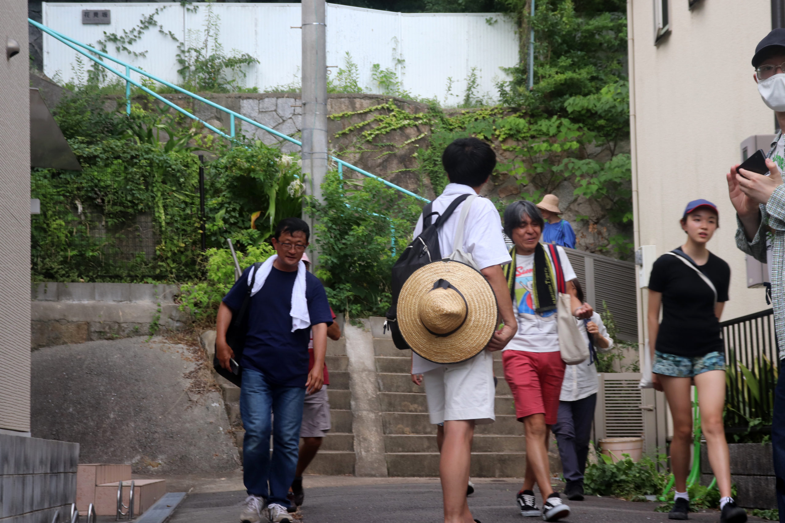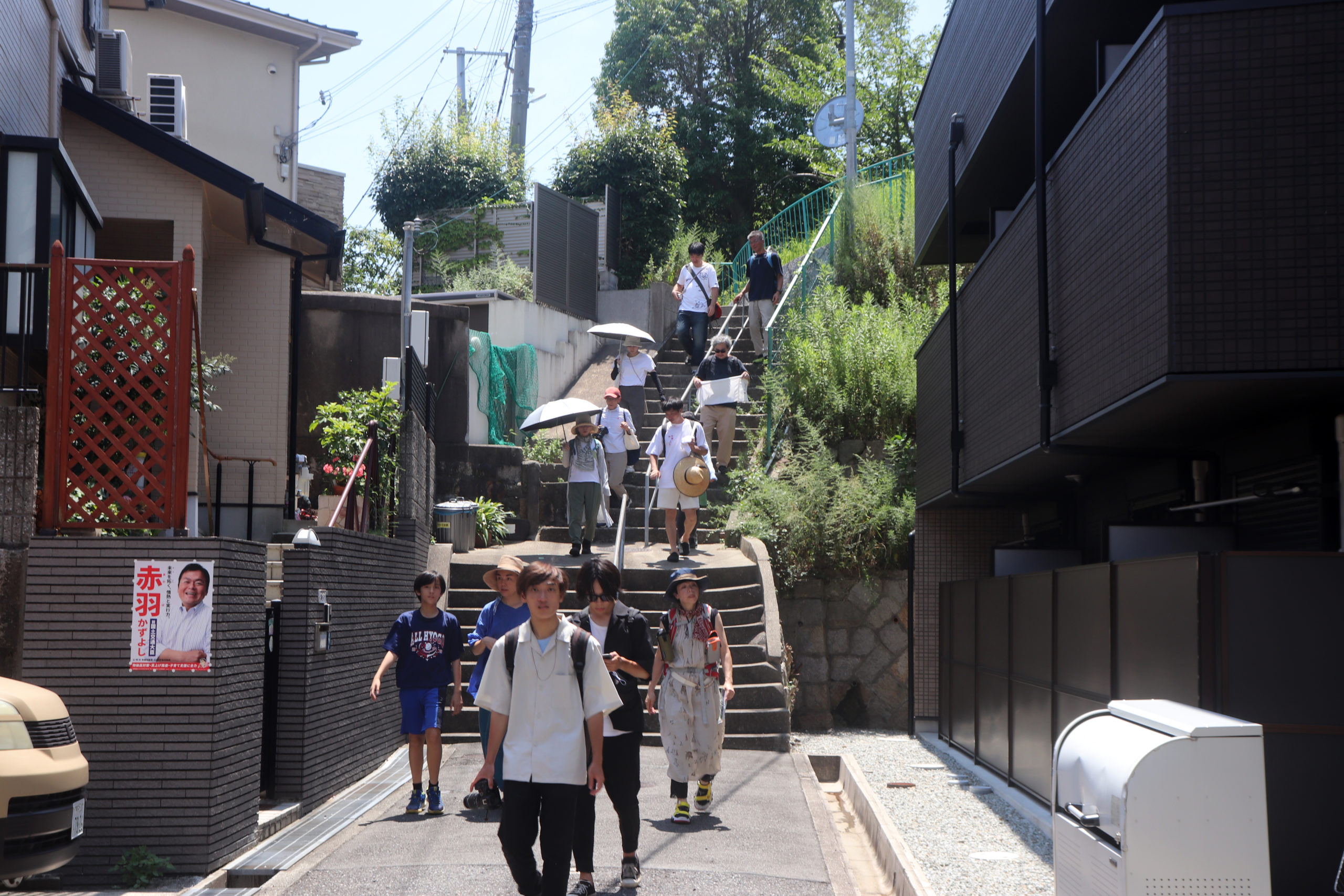 楽しい遊具をみたり、池永植物研究所跡の碑をみたり、湊川公園の聖徳太子が乗ってたらしい馬の像をみたり、お昼ご飯が大充実の湊川エリアを満喫したり、国登録有形文化財がレストランになってるla muraに特別に入らせてもらって説明を聞いたり、大事な歴史の神戸電鉄朝鮮人労働者の像をみたり、善光寺の平業盛塚をみたり、変わった場所にある聖徳太子像をみたり、「吹けば飛ぶよな男だが」のロケ地にもなったお屋敷を横目でみたり、と、その場所場所もおもろかったのですが、やはりこの「勝手にまち探訪」は、その道中を楽しみ尽くすのが醍醐味ですよね。今回も起伏、家、坂、階段、塀、崖、溝、植物、人々から滲み出す色んなものがワンダフォー!でした。神鉄の敷地なのでは?というフェンス内で立派に作物を育てている田畑を見た時は、ここは楽園?ってなったりしました。横幅20mはありそうな今では無用とも思われる宝塚の大階段のような階段があったり。坂が急で普通に停めたら倒れるのか、チャリが上下ひっくり返って置かれていたり。何重にも時代が重なって、でも最近はモルタルで塗っただけだな?という擁壁があったり。巨大な人間ピタゴラスイッチなゴミステーションがあったり。