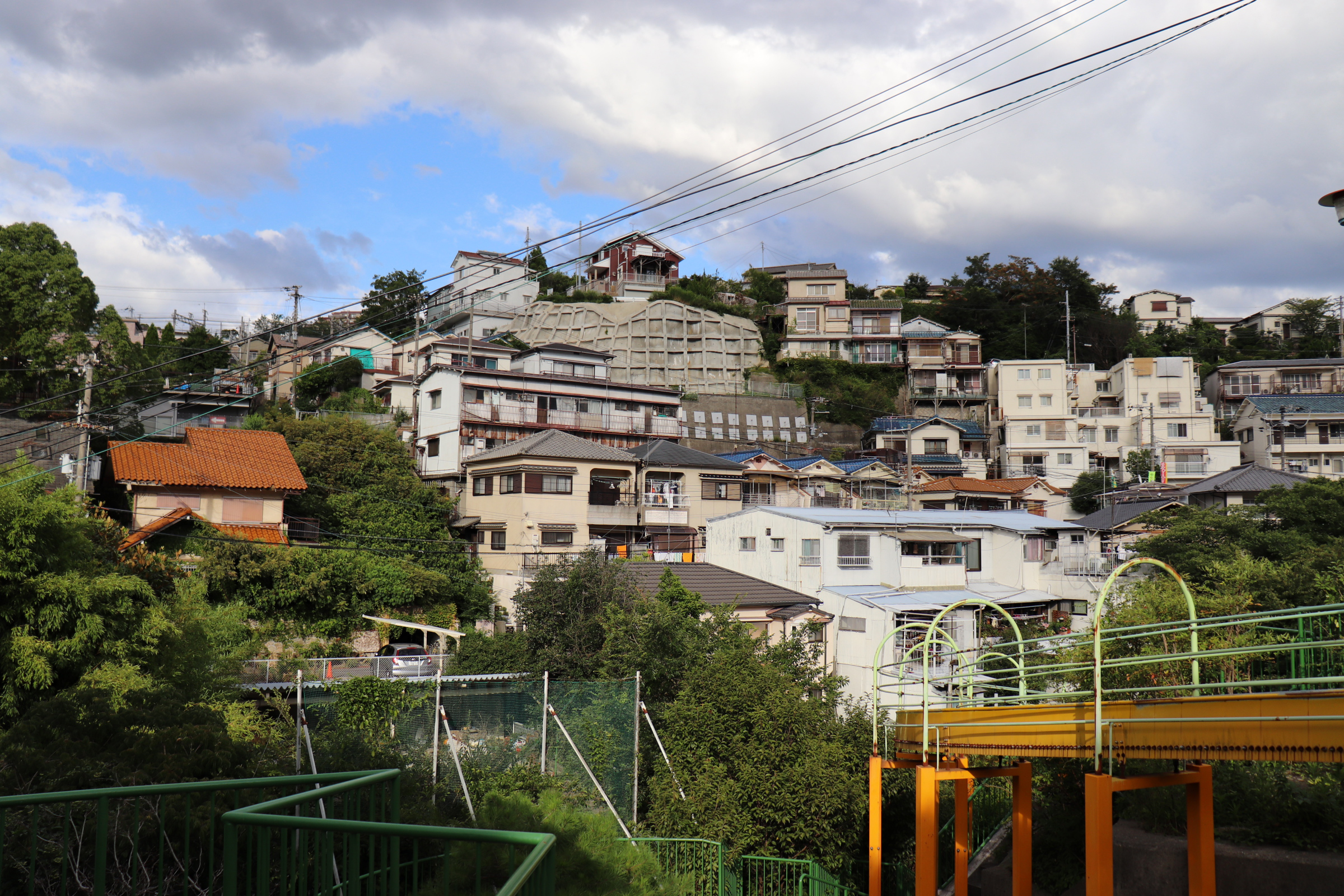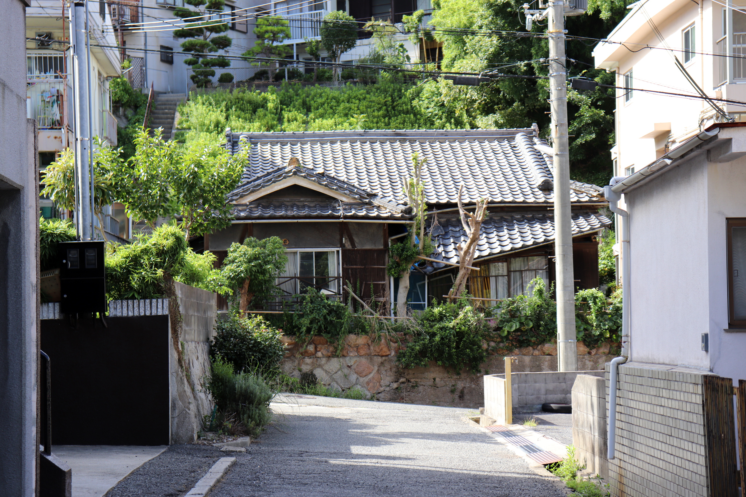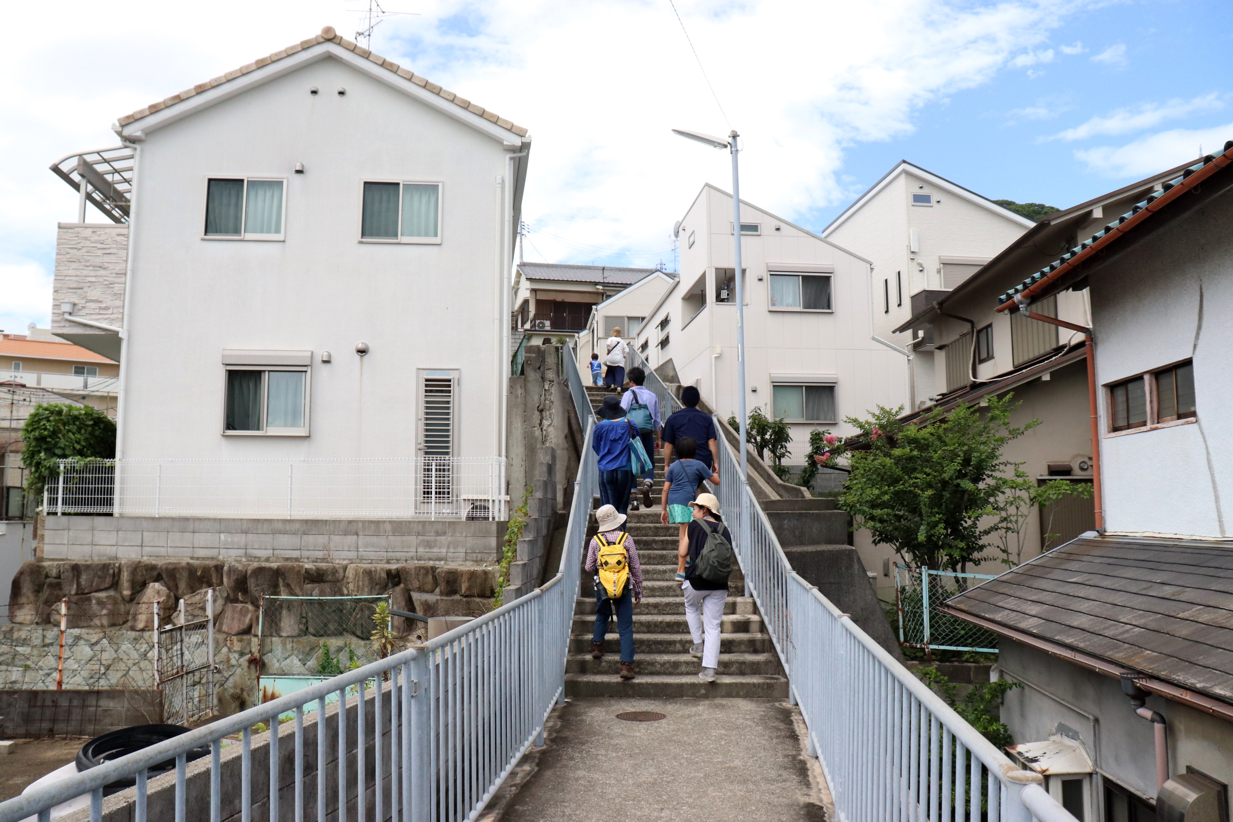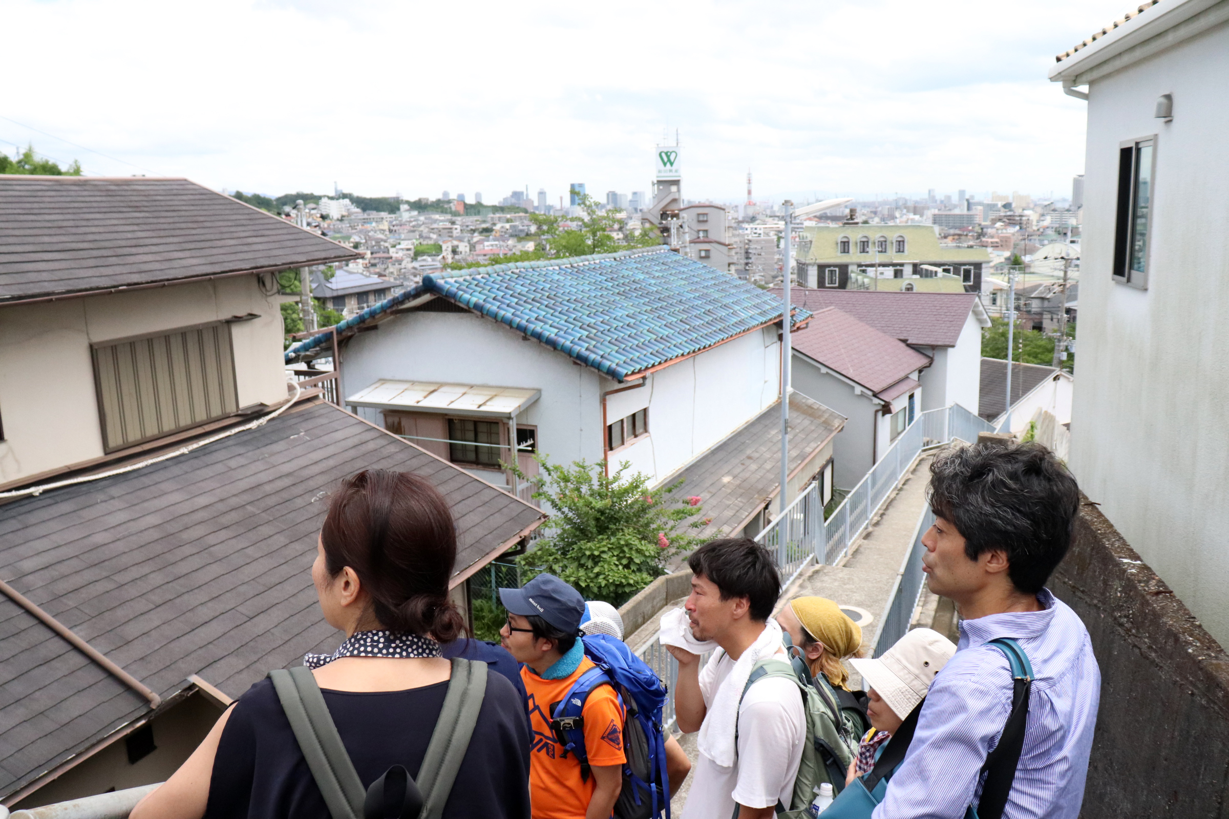 高取山頂まで登ってからは六甲全山縦走路に沿って丸山登山口に降り、そこから神戸電鉄丸山駅まで。このあたりには戸建て住宅の他に木造アパートが多い。これは神戸が海と山が近く平地が少ないために、湾岸部にある製鉄所や造船所などで働く労働者が暮らす住宅を傾斜地に作ったことによっている。丸山駅周辺も庶民的なたたずまいを見せていて、高級住宅地を想像していると肩透かしを喰らうのだが、参加いただいた皆さんはまちのリテラシーが高く、こういう文脈も含めて面白がっていただけた。
