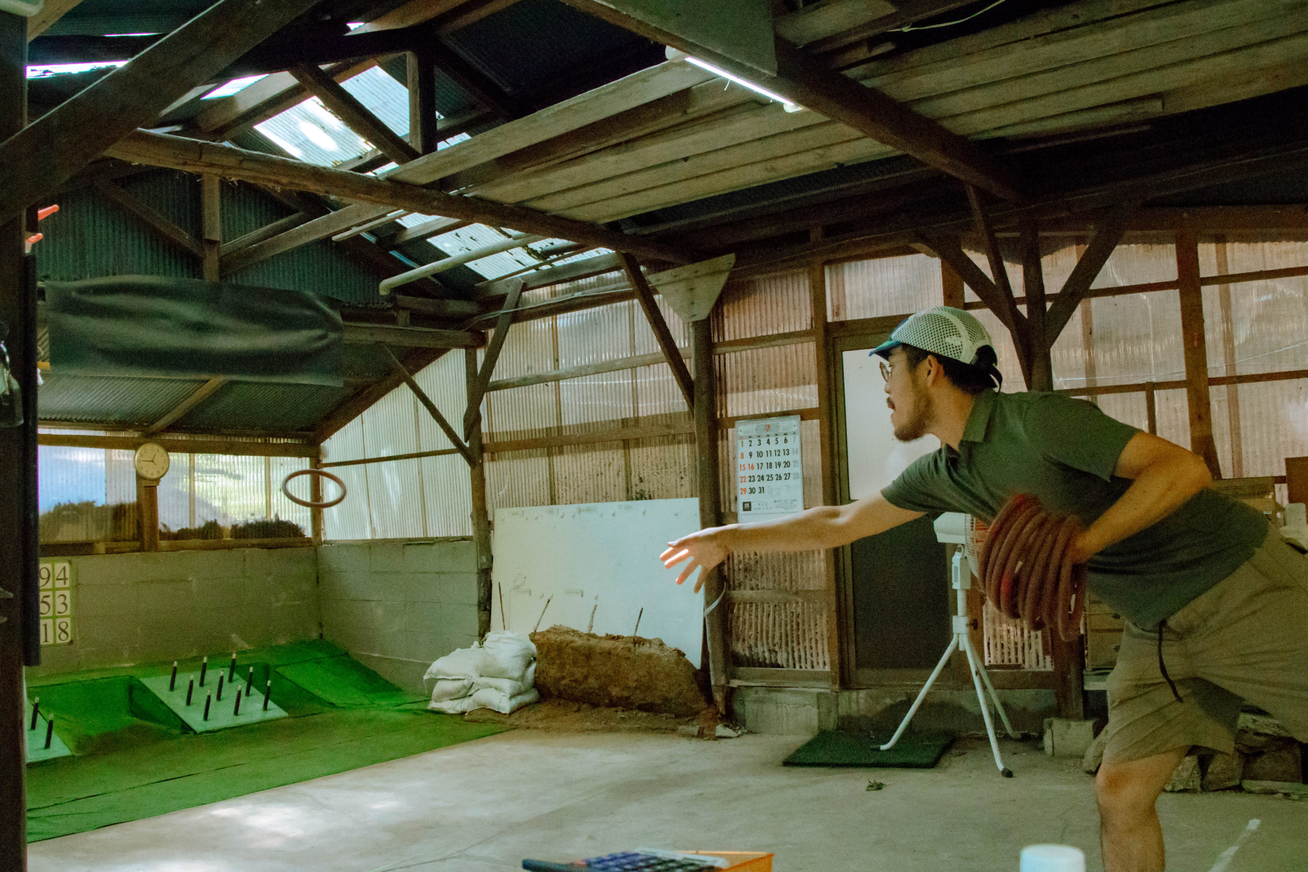 高取山(標高328m)には現在4軒の茶屋があり、そのすべてに投輪場が存在する。投輪とは100年ほど前にイギリス人が客船で遊んでいた輪投げを神戸の船乗りや造船所の労働者たちが真似して始め、ルールを整え、スポーツとして確立させたものである。高取山には投輪文化がいまも根付いていて、山麓に住む方々や企業の投輪部に所属する方々が日々投輪場で練習に励んでおられる。今回は参加者のみなさんにこの投輪を楽しんでいただいた。