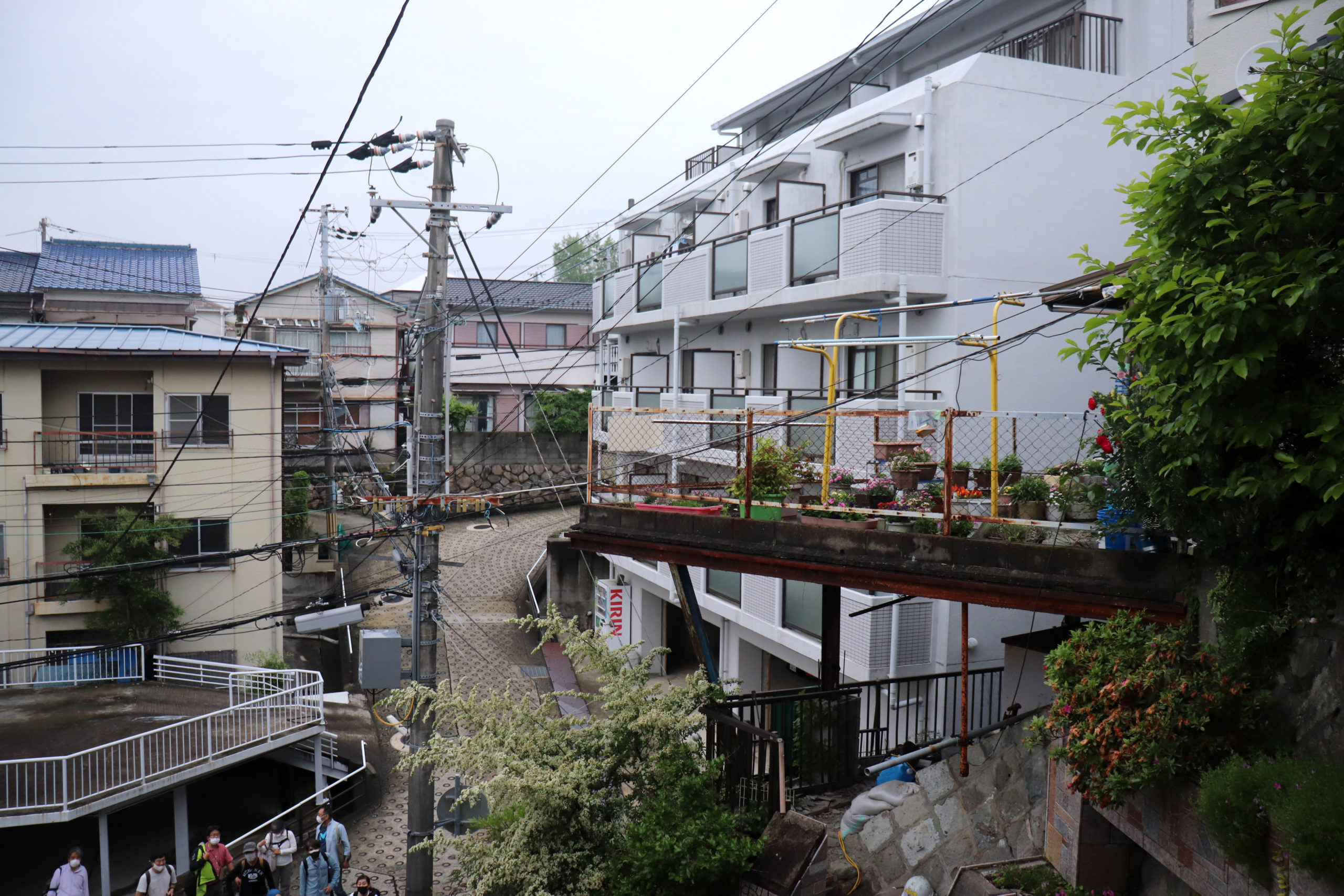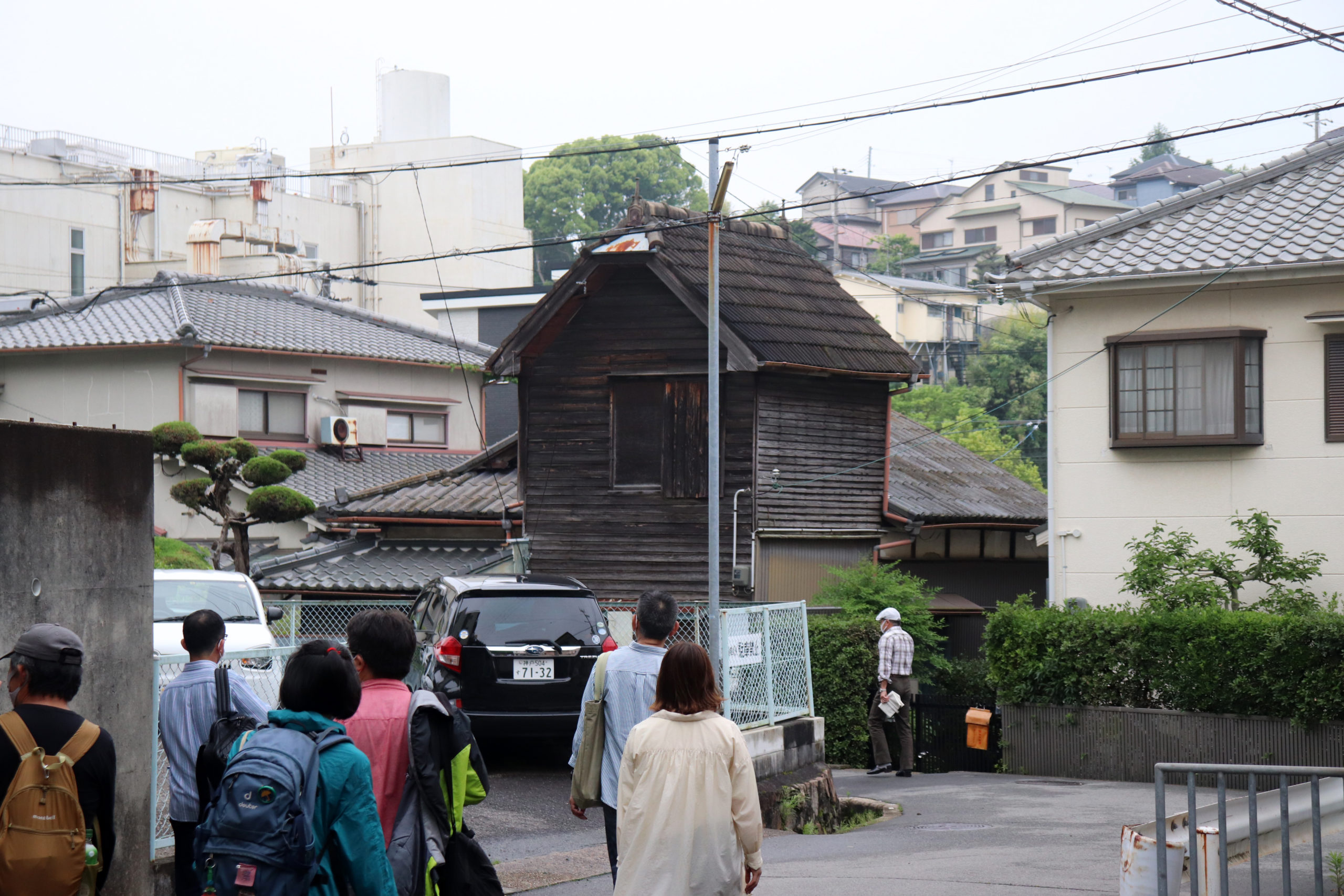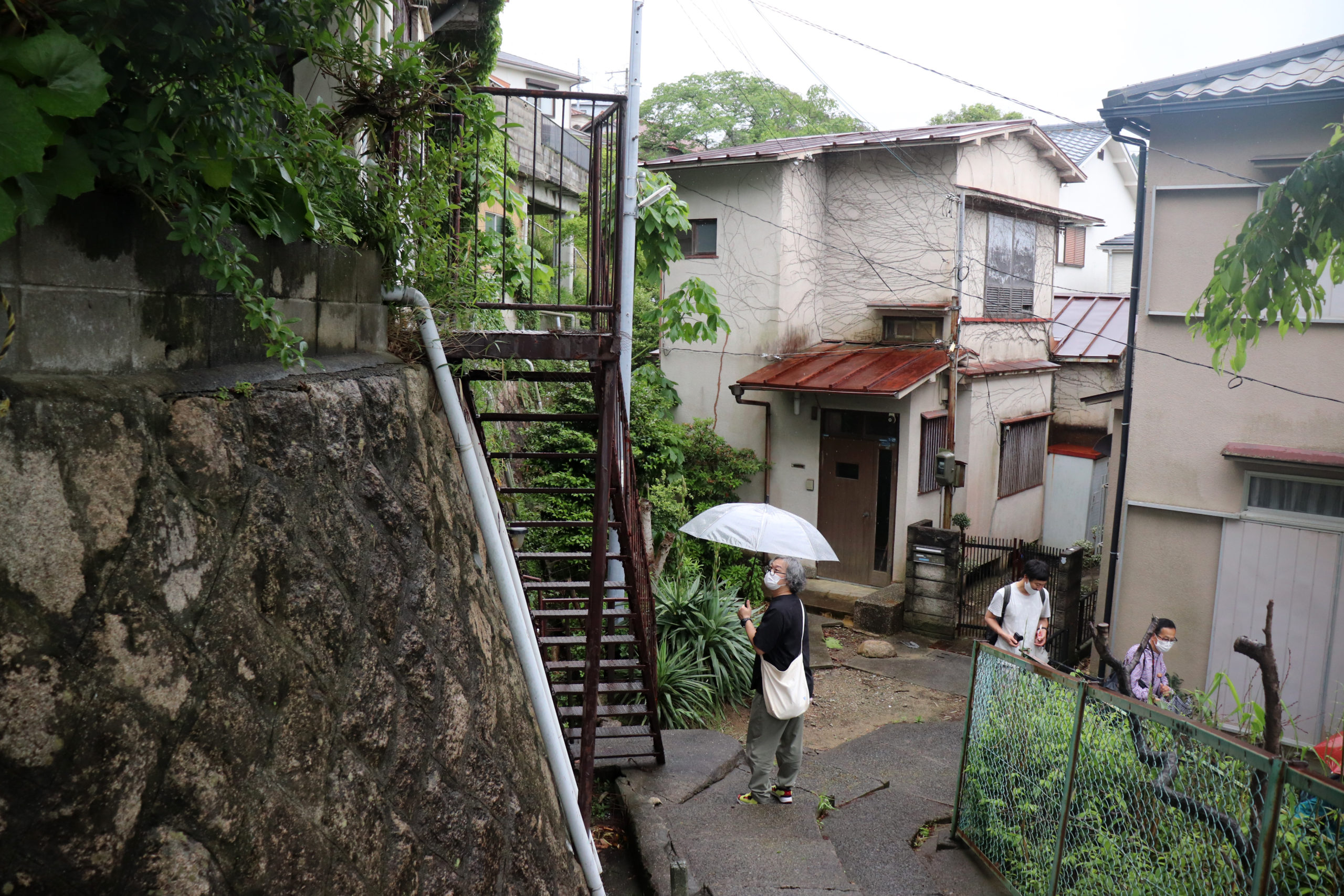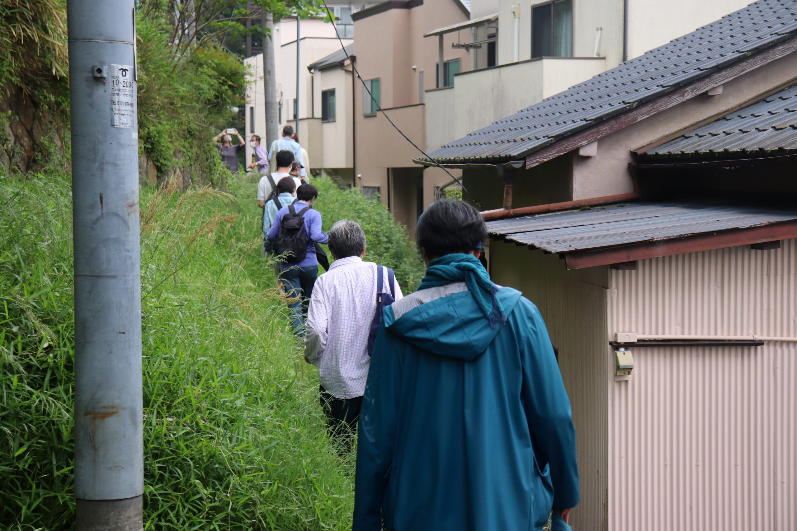 生憎の雨天での開催になったが、神鉄鈴蘭台車庫とその周辺、神戸明石線の高架の下で自己紹介タイムをやってからの、東町の別荘地の面影から1950年代以降の斜面住宅地の形成過程をなぞるように歩いた。途中で、移住して来たアーティストの開いた「ギャラリー」にも立ち寄ったり。小部小学校から貸し農園になっているかつての水田と旧兵庫商業高校西側の小道から神社の高台にアタック。超絶な階段や持ち出し基礎の人工地盤上のアパートなどの絶景を見せて、旧北区役所のあたりもトレースして、町歩きを終えた。