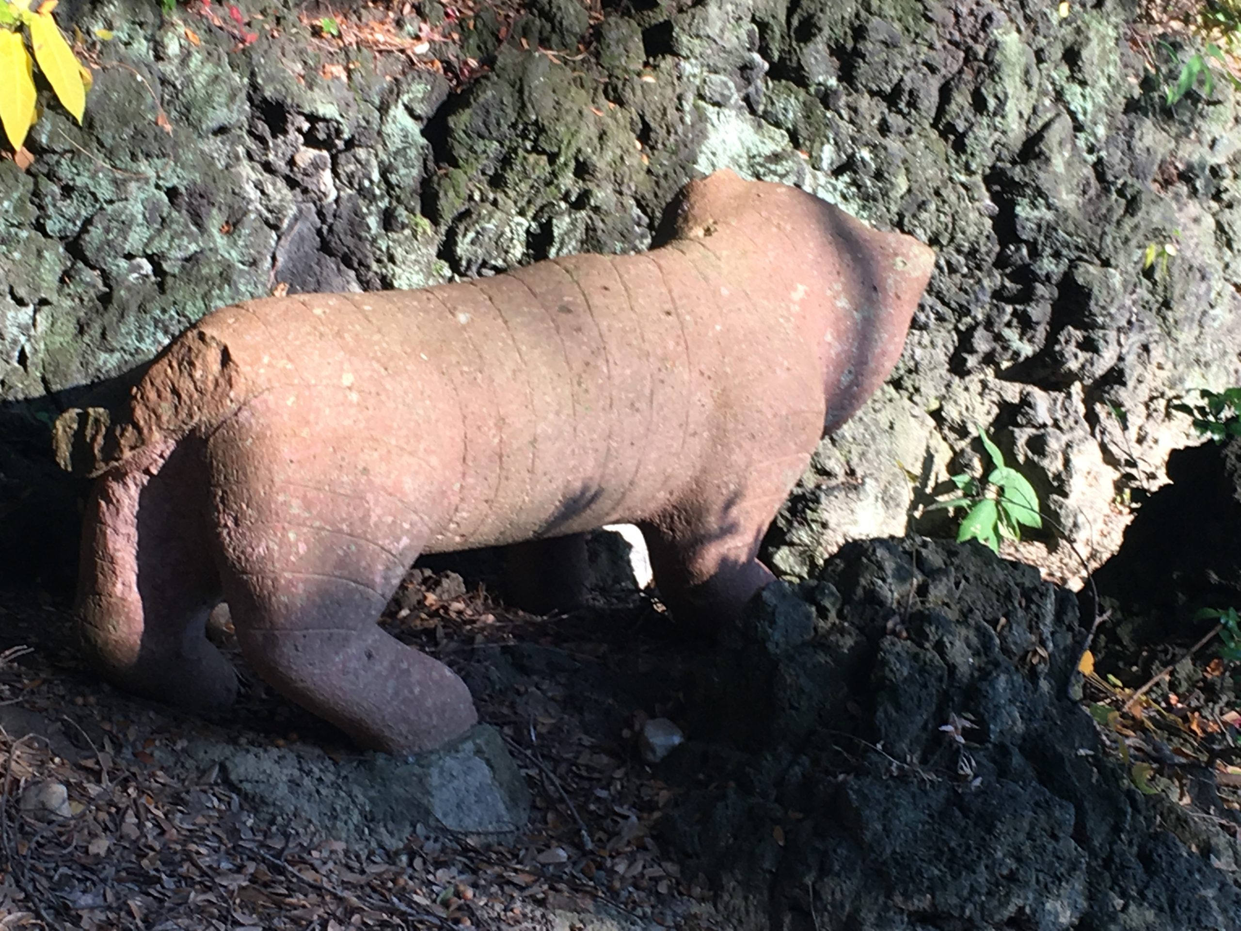 「異人住宅地」という呼称はあまり耳にしたことがないものの、現地取材をしたうえで書いていることは間違いない。そして、ここに書いてあるとおり、咎められたことはないから、私たちもときにジェームス山外国人住宅地に「迷い込む」。家々がゆったりした配置の庭の広い住宅地は散歩に適している。かつては敷地内に小さな動物園もあったと聞く。ライオンのみならず、茂みの中にトラの像もある。