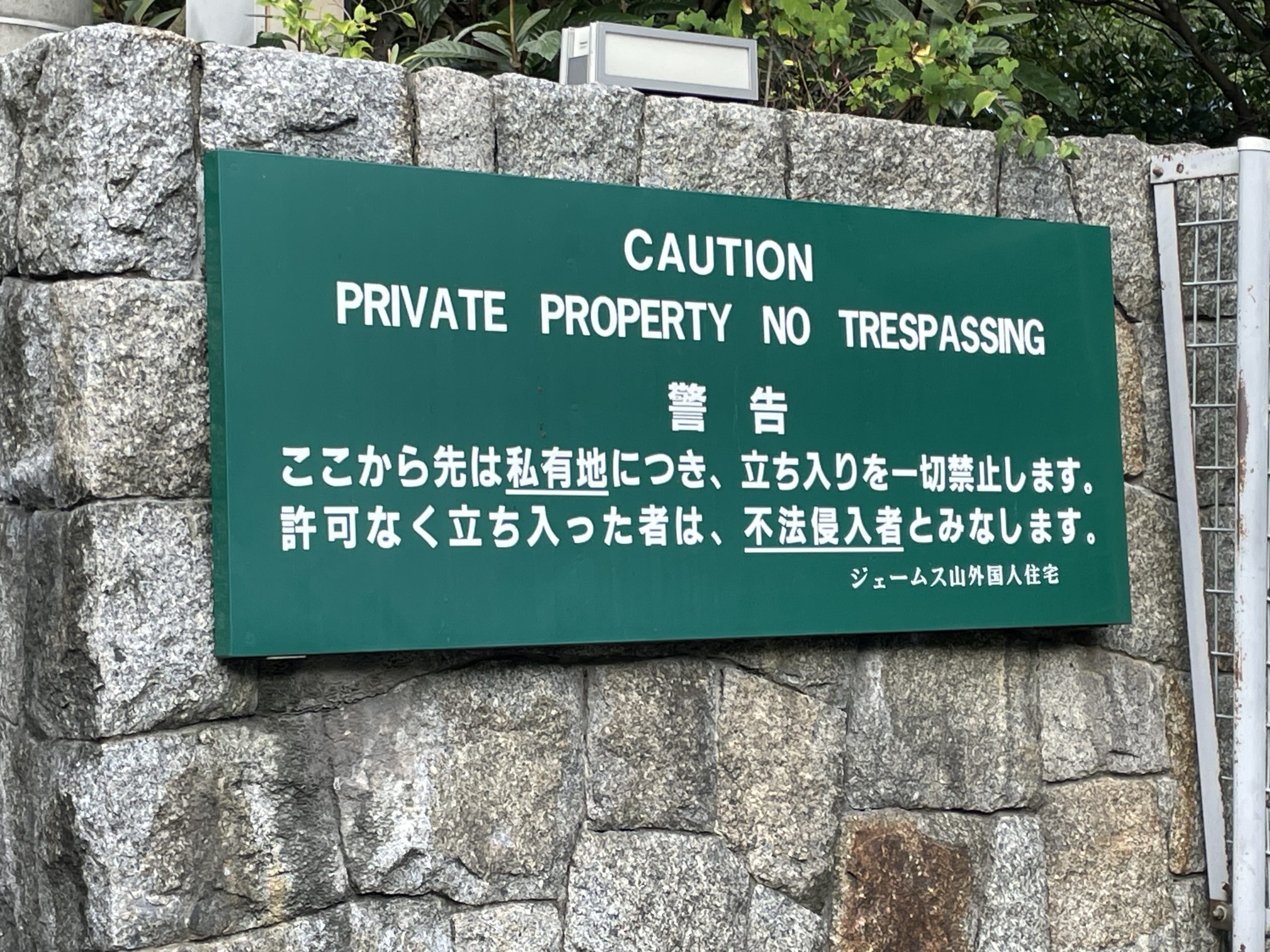 「ここから先は私有地につき、立ち入りを一切禁止します。許可なく立ち入った者は、不法侵入者とみなします。ジェームス山外国人住宅」