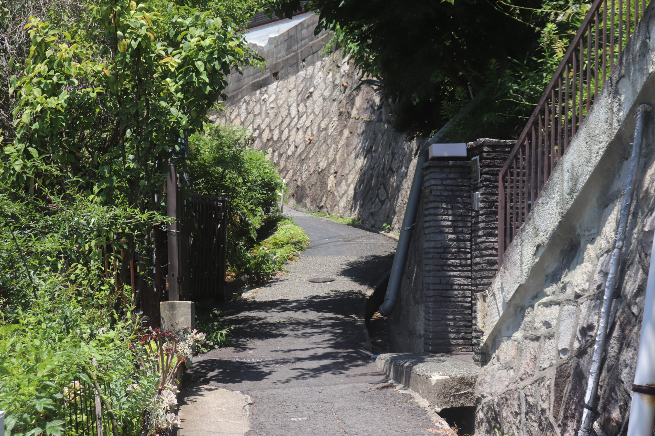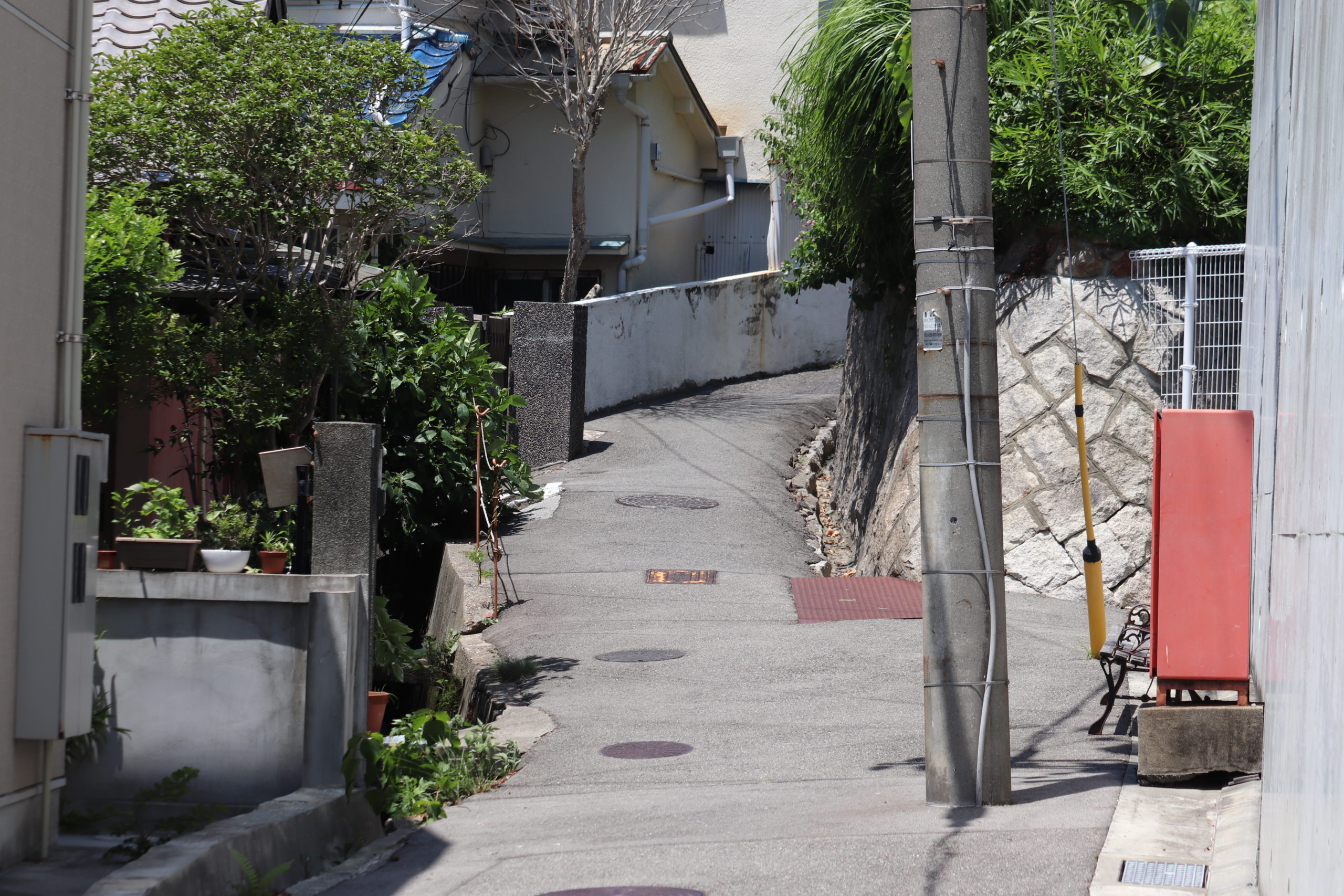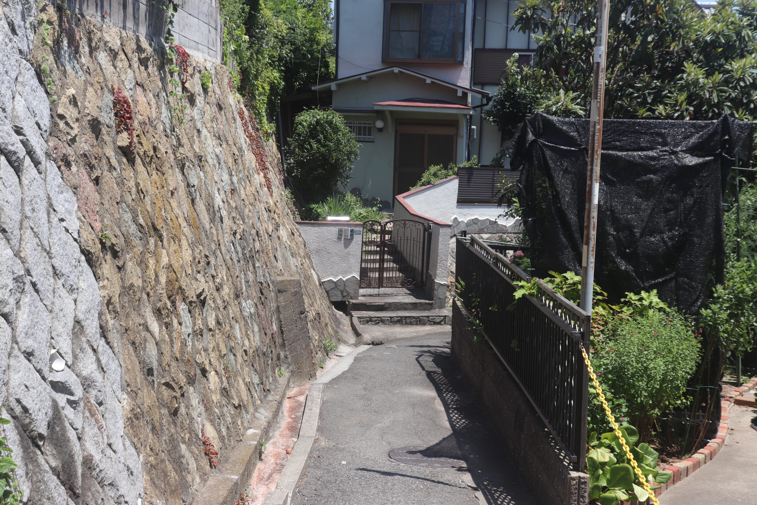 というわけで、「塩屋町5丁目|高尾小谷天神ヶ平の坂」。南東側から入るとすぐに山陽電鉄の線路とひっつく。実はここ、昔は山陽電鉄と国鉄を横切って海まで駆け抜ける道があったらしい。そこから黄色い滑り止めが貼りつけられた(緑が映える)道を抜けて右折、くねくねと細道をのぼる。友人知人がいるのでこの細くて急な坂道の引越しも何度か手伝った。チームワークも個人的スキルも坂を登り降りする度に上がっていく。めちゃめちゃしんどいけどめちゃめちゃたのしい。