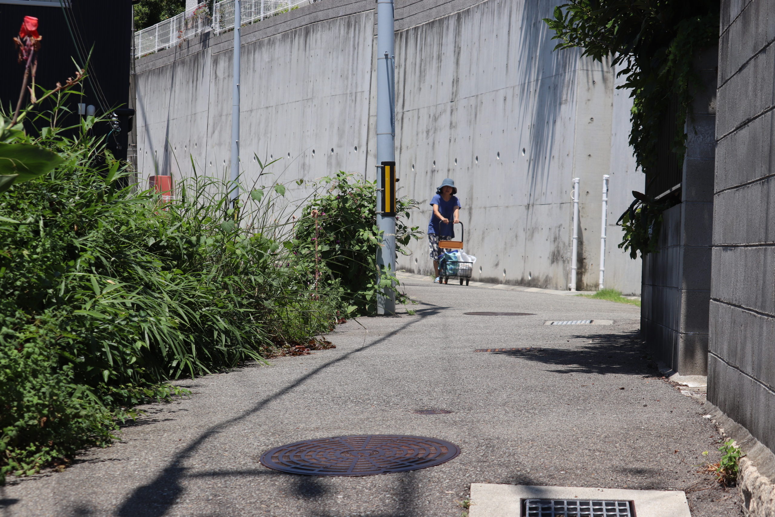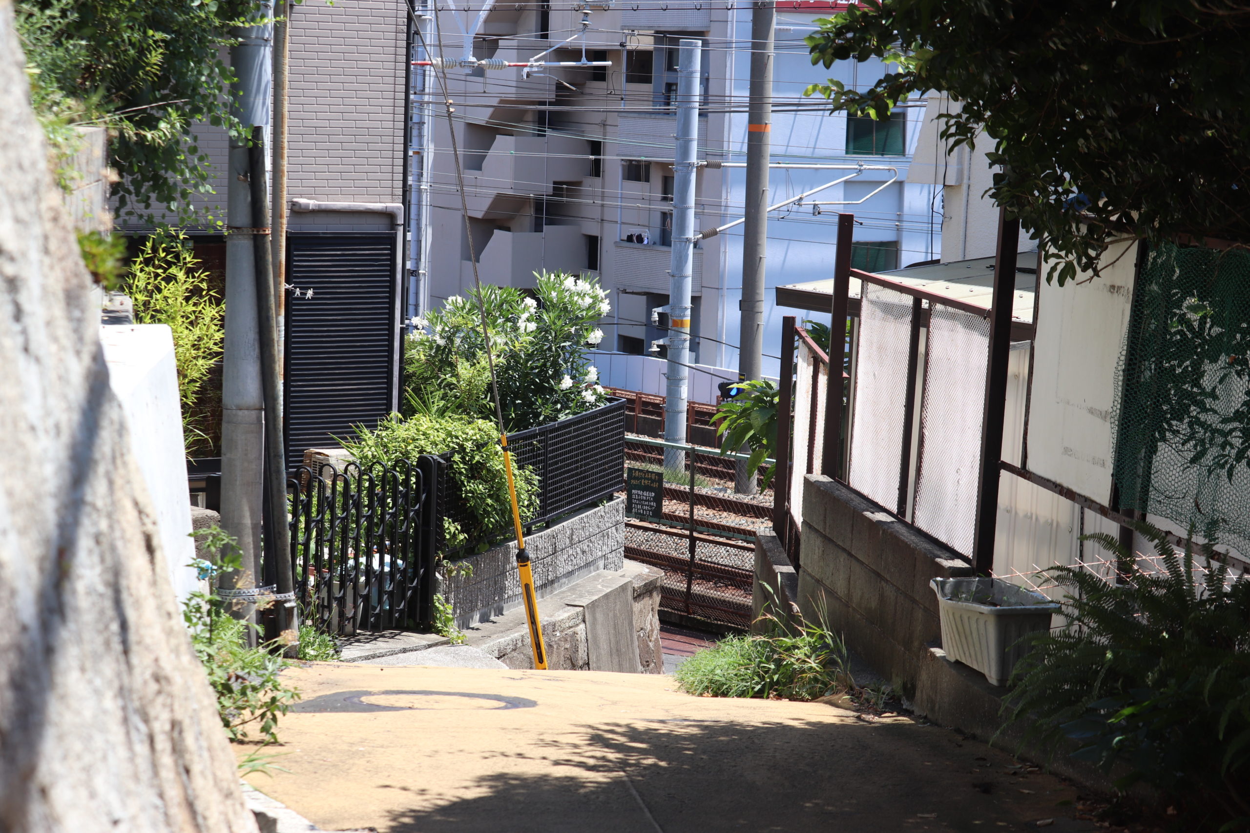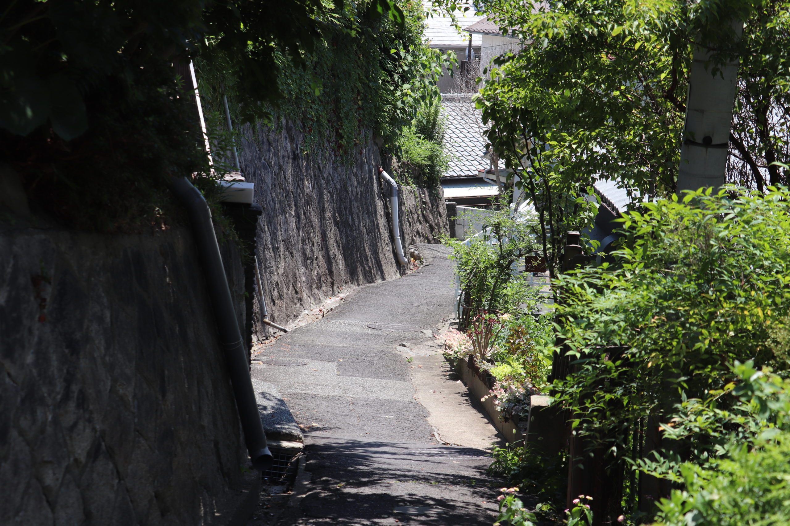 というわけで、「塩屋町5丁目|高尾小谷天神ヶ平の坂」。南東側から入るとすぐに山陽電鉄の線路とひっつく。実はここ、昔は山陽電鉄と国鉄を横切って海まで駆け抜ける道があったらしい。そこから黄色い滑り止めが貼りつけられた(緑が映える)道を抜けて右折、くねくねと細道をのぼる。友人知人がいるのでこの細くて急な坂道の引越しも何度か手伝った。チームワークも個人的スキルも坂を登り降りする度に上がっていく。めちゃめちゃしんどいけどめちゃめちゃたのしい。