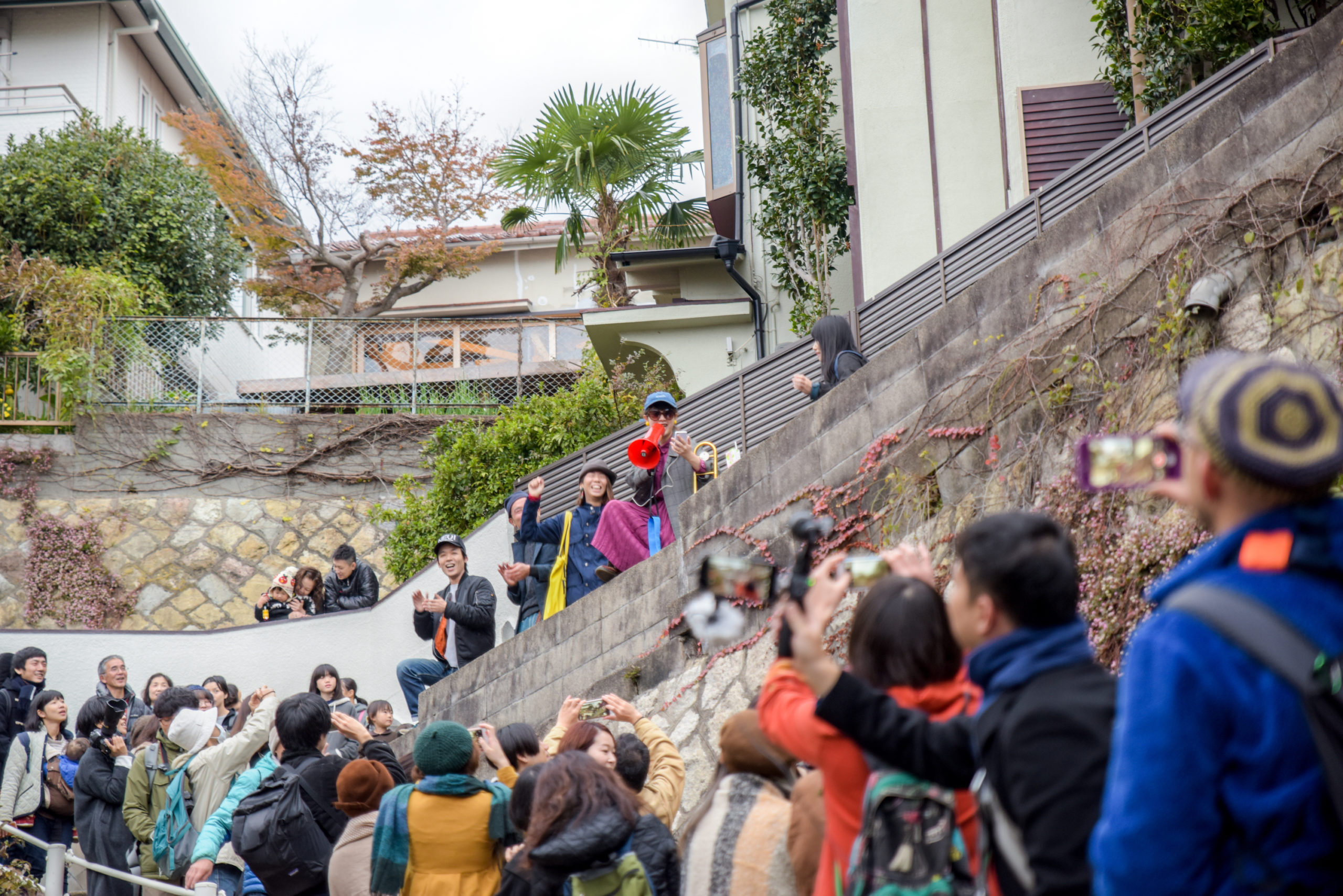 2時間半まちをぐるっと歩く間に、家のベランダやビルの屋上や階段や塀の上から、総勢40組近くの塩屋在住のアーティストが顔を出し、短い人は数十秒、長くて数分のパフォーマンスを繰り広げる。段差があればそれはステージ。